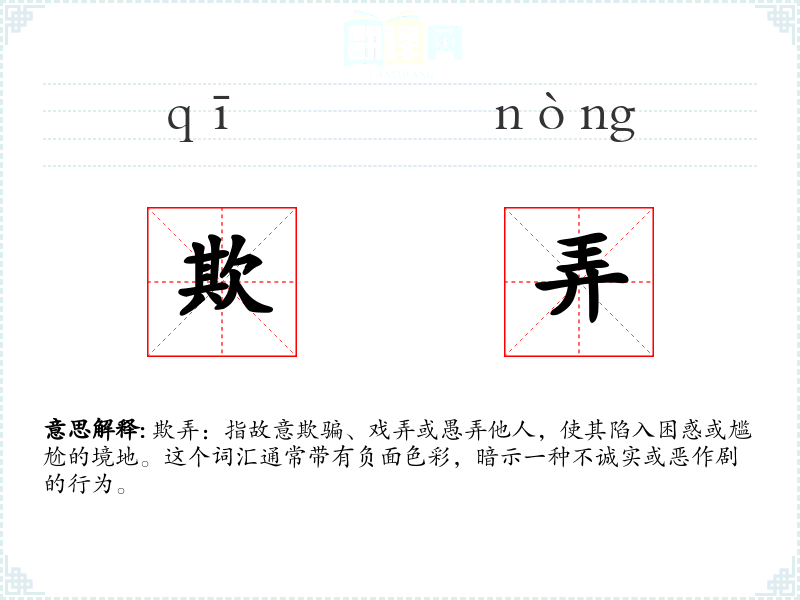 欺弄:指故意欺骗、戏弄或愚弄他人,使其陷入困惑或尴尬的境地。这个词汇通常带有负面色彩,暗示一种不诚实或恶作剧的行为。