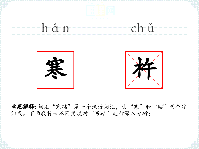 词汇“寒砧”是一个汉语词汇,由“寒”和“砧”两个字组成。下面我将从不同角度对“寒砧”进行深入分析: