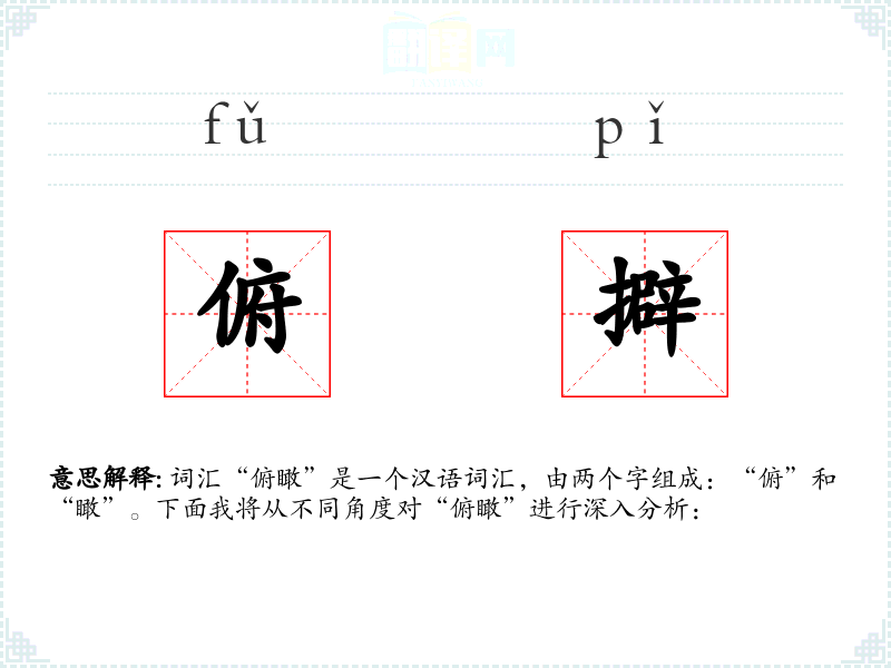 - 演变:在古代文献中,“俯”和“瞰”常分开使用,后来逐渐结合成一个词,表示从高处向下看。