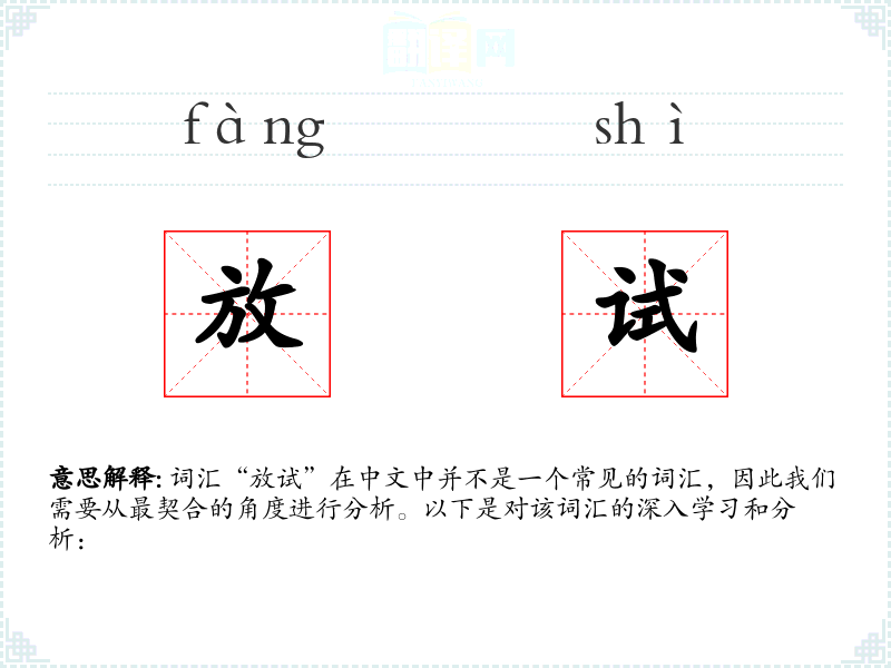 词汇“放试”在中文中并不是一个常见的词汇,因此我们需要从最契合的角度进行分析。以下是对该词汇的深入学*和分析: