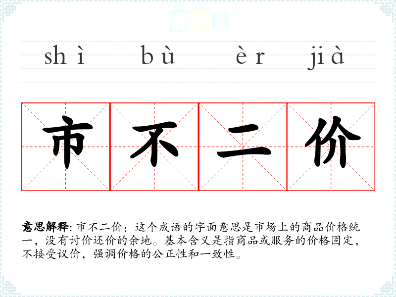 市不二价:这个成语的字面意思是市场上的商品价格统一,没有讨价还价的余地。基本含义是指商品或服务的价格固定,不接受议价,强调价格的公正性和一致性。