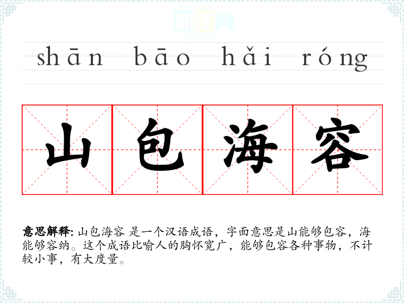 山包海容 是一个汉语成语,字面意思是山能够包容,海能够容纳。这个成语比喻人的胸怀宽广,能够包容各种事物,不计较小事,有大度量。