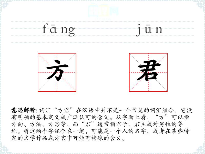 在其他语言中,可能没有直接对应“方君”的词汇,因为它不是一个标准词汇。