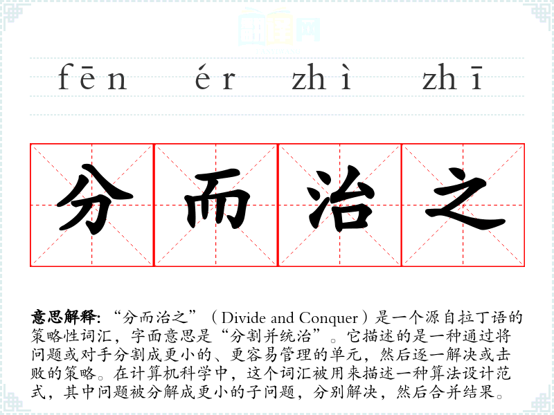 “分而治之”(Divide and Conquer)是一个源自拉丁语的策略性词汇,字面意思是“分割并统治”。它描述的是一种通过将问题或对手分割成更小的、更容易管理的单元,然后逐一解决或击败的策略。在计算机科学中,这个词汇被用来描述一种算法设计范式,其中问题被分解成更小的子问题,分别解决,然后合并结果。