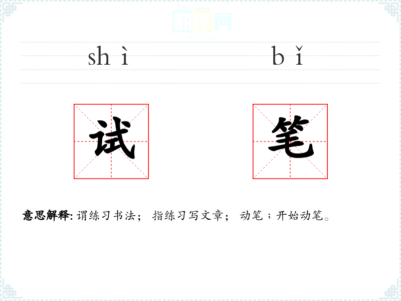 谓练习书法; 指练习写文章; 动笔﹔开始动笔。