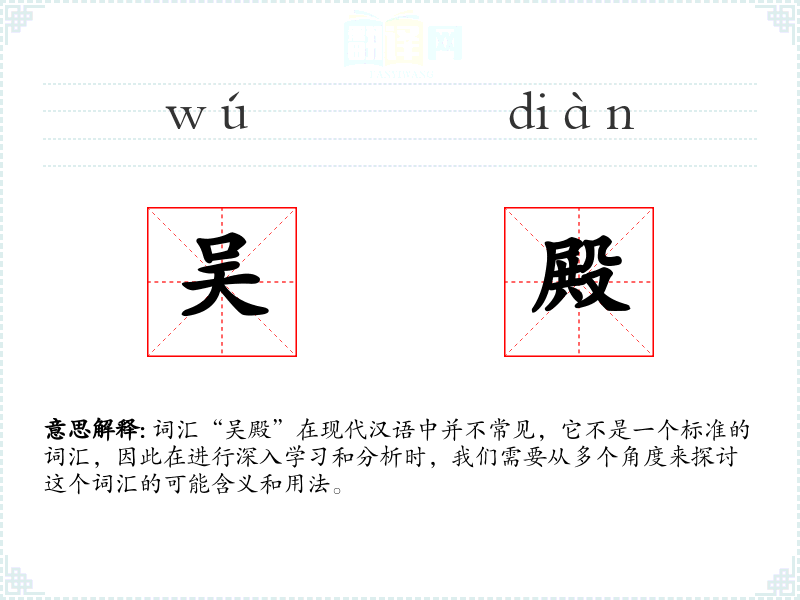由于“吴殿”不是一个标准的词汇,我们无法给出一个确切的字面意思和基本含义。它可能是某个特定地区或方言中的词汇,或者是某个特定文化背景下的用语。