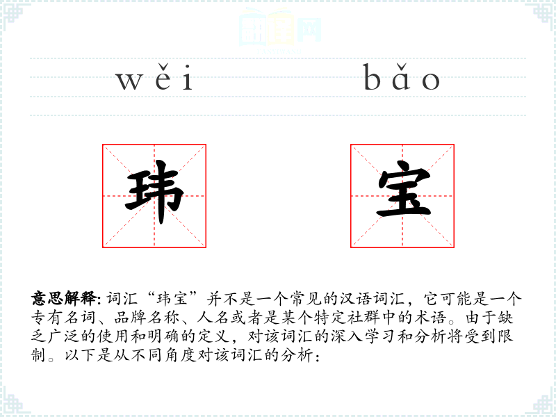 由于“玮宝”不是一个标准词汇,它的字面意思和基本含义不明确。它可能是由两个汉字组合而成的,其中“玮”可能指的是一种美玉,而“宝”通常指的是珍贵的东西。因此,“玮宝”可能被理解为“珍贵的玉”或“宝贵的物品”。