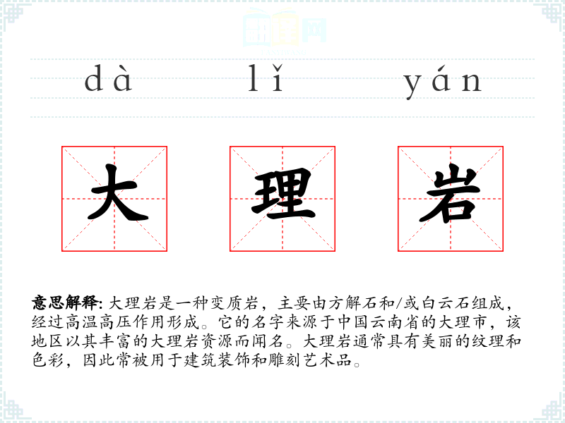 - 反义词:花岗岩( granite):花岗岩是一种火成岩,与大理岩在形成过程和成分上有显著差异。