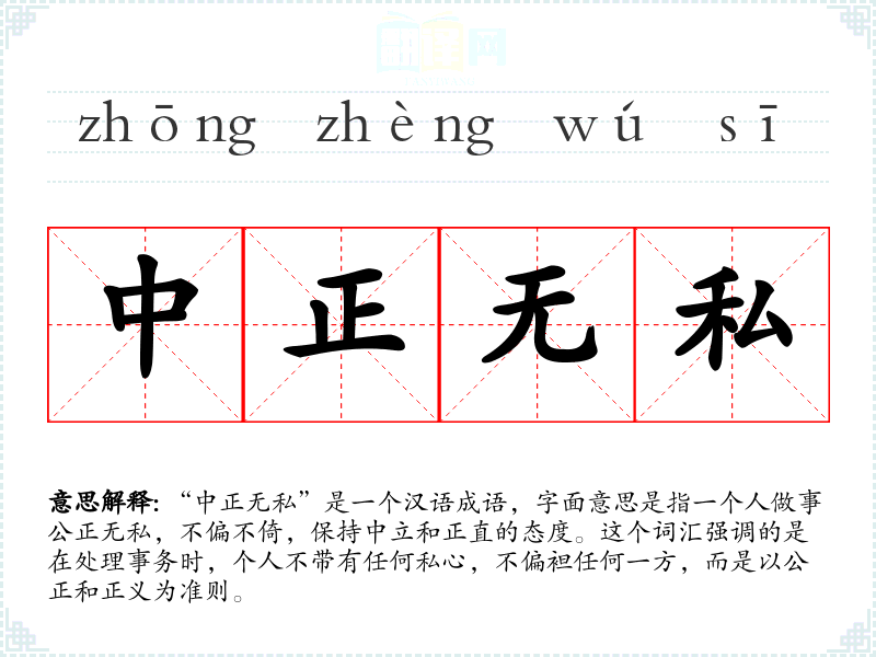 “中正无私”是一个汉语成语,字面意思是指一个人做事公正无私,不偏不倚,保持中立和正直的态度。这个词汇强调的是在处理事务时,个人不带有任何私心,不偏袒任何一方,而是以公正和正义为准则。