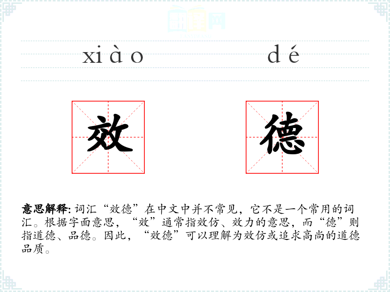 词汇“效德”在中文中并不常见,它不是一个常用的词汇。根据字面意思,“效”通常指效仿、效力的意思,而“德”则指道德、品德。因此,“效德”可以理解为效仿或追求高尚的道德品质。