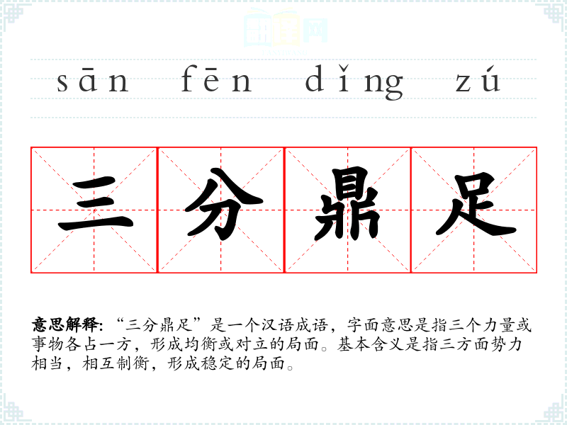 “三分鼎足”是一个汉语成语,字面意思是指三个力量或事物各占一方,形成均衡或对立的局面。基本含义是指三方面势力相当,相互制衡,形成稳定的局面。