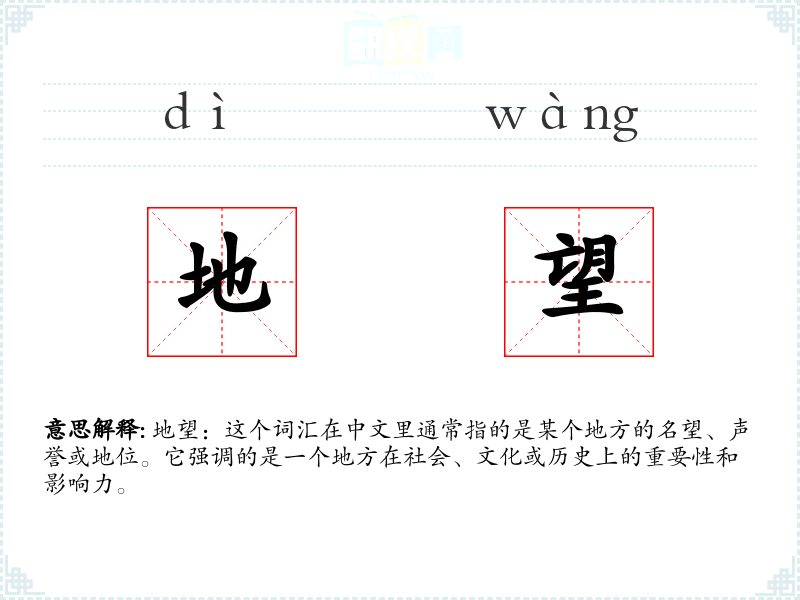 地望:这个词汇在中文里通常指的是某个地方的名望、声誉或地位。它强调的是一个地方在社会、文化或历史上的重要性和影响力。