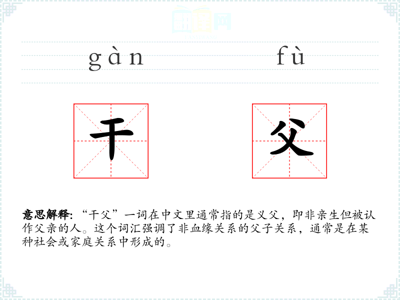 “干父”一词在中文里通常指的是义父,即非亲生但被认作父亲的人。这个词汇强调了非血缘关系的父子关系,通常是在某种社会或家庭关系中形成的。