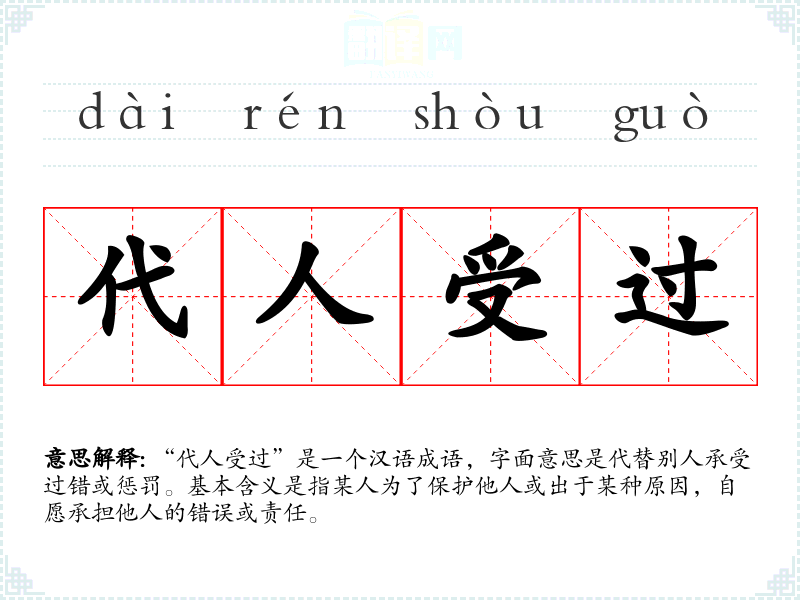 “代人受过”是一个汉语成语,字面意思是代替别人承受过错或惩罚。基本含义是指某人为了保护他人或出于某种原因,自愿承担他人的错误或责任。