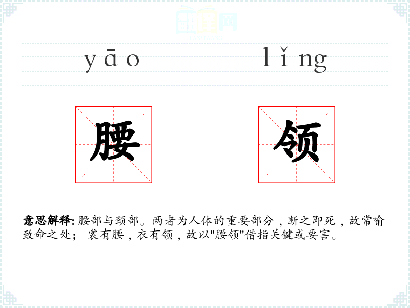 腰部与颈部。两者为人体的重要部分﹐断之即死﹐故常喻致命之处; 裳有腰﹐衣有领﹐故以"腰领"借指关键或要害。