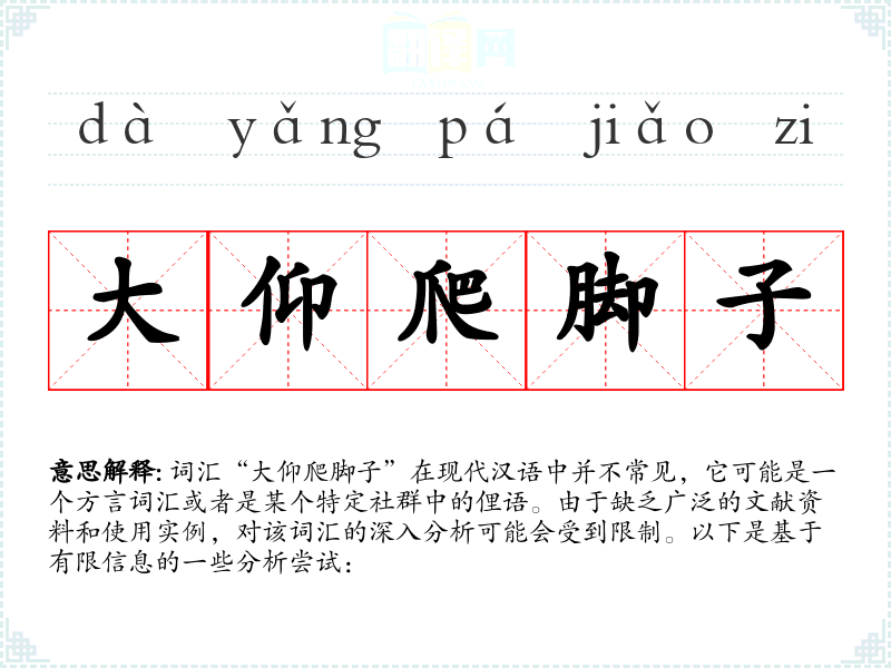 词汇“大仰爬脚子”在现代汉语中并不常见,它可能是一个方言词汇或者是某个特定社群中的俚语。由于缺乏广泛的文献资料和使用实例,对该词汇的深入分析可能会受到限制。以下是基于有限信息的一些分析尝试: