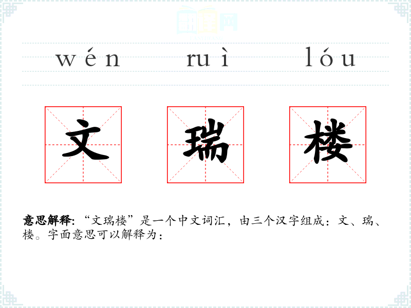 “文瑞楼”是一个中文词汇,由三个汉字组成:文、瑞、楼。字面意思可以解释为: