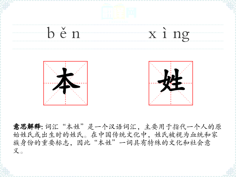 - 口语:在日常对话中,人们可能会用“本姓”来区分某人现在的姓氏和最初的姓氏,尤其是在讨论家族历史或个人背景时。
