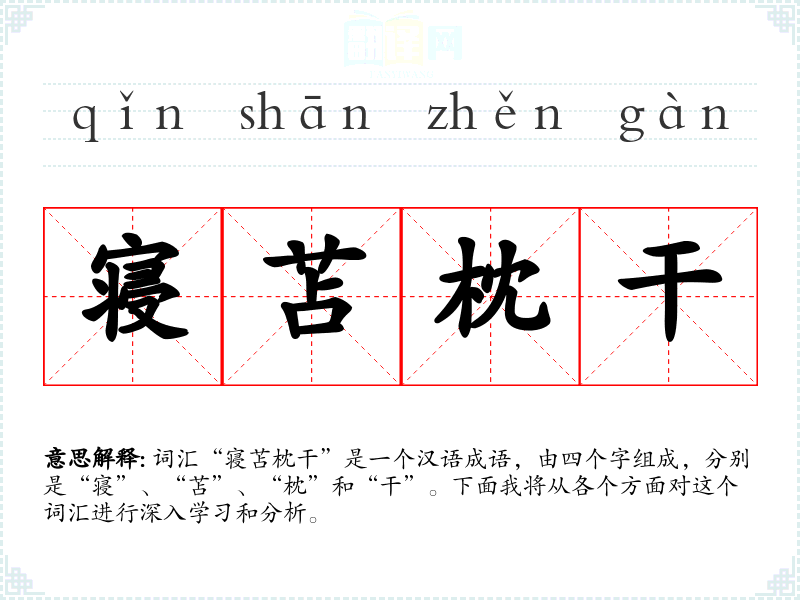 词汇“寝苫枕干”是一个汉语成语,由四个字组成,分别是“寝”、“苫”、“枕”和“干”。下面我将从各个方面对这个词汇进行深入学*和分析。