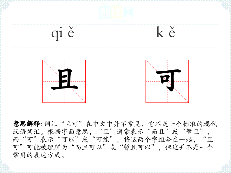 词汇“且可”在中文中并不常见,它不是一个标准的现代汉语词汇。根据字面意思,“且”通常表示“而且”或“暂且”,而“可”表示“可以”或“可能”。将这两个字组合在一起,“且可”可能被理解为“而且可以”或“暂且可以”,但这并不是一个常用的表达方式。