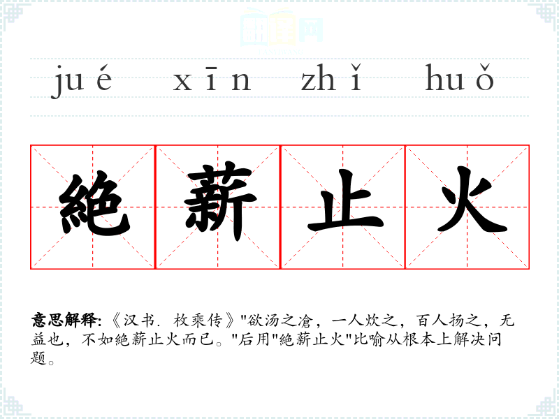 《汉书.枚乘传》"欲汤之凔,一人炊之,百人扬之,无益也,不如絶薪止火而已。"后用"絶薪止火"比喻从根本上解决问题。