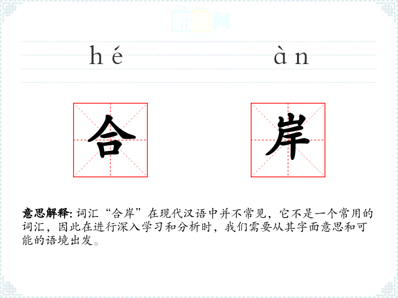词汇“合岸”在现代汉语中并不常见,它不是一个常用的词汇,因此在进行深入学*和分析时,我们需要从其字面意思和可能的语境出发。