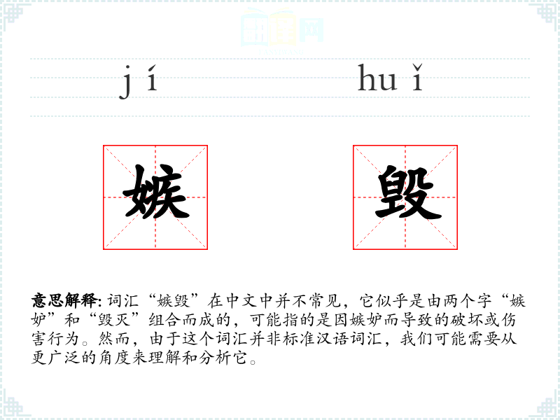 词汇“嫉毁”在中文中并不常见,它似乎是由两个字“嫉妒”和“毁灭”组合而成的,可能指的是因嫉妒而导致的破坏或伤害行为。然而,由于这个词汇并非标准汉语词汇,我们可能需要从更广泛的角度来理解和分析它。