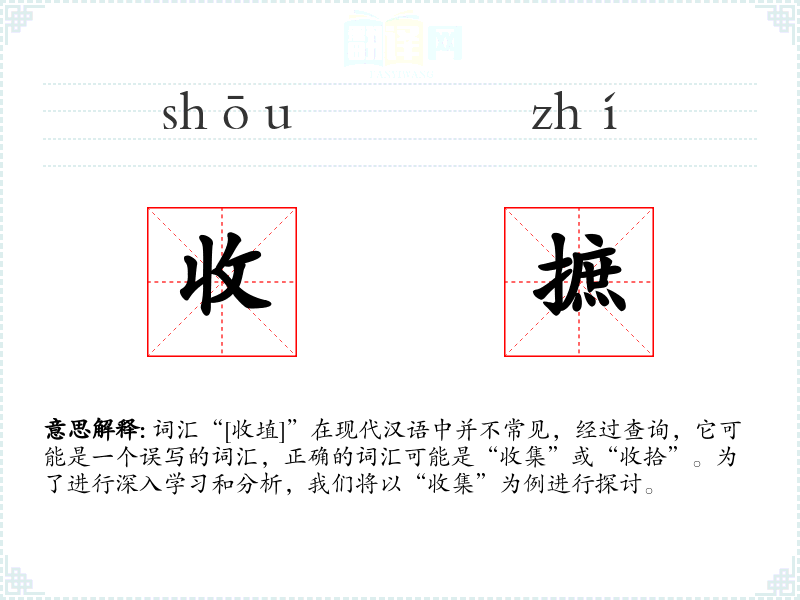 词汇“[收埴]”在现代汉语中并不常见,经过查询,它可能是一个误写的词汇,正确的词汇可能是“收集”或“收拾”。为了进行深入学习和分析,我们将以“收集”为例进行探讨。