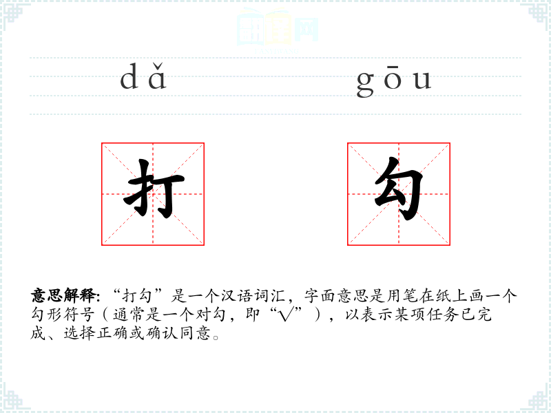 - 口语:在日常对话中,“打勾”常用于描述确认某事或完成某项任务的动作,例如:“我已经把作业打勾了。”