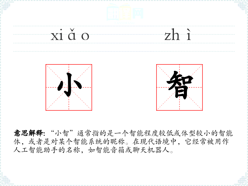“小智”这个词可能是由“小”和“智”两个字组合而成,其中“小”表示尺寸或程度的较小,“智”表示智慧或智能。这个词在近年来随着人工智能技术的发展而变得更加流行。