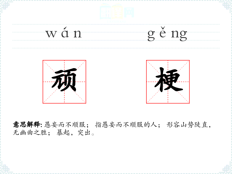愚妄而不顺服; 指愚妄而不顺服的人; 形容山势陡直,无幽曲之胜; 暴起,突出。