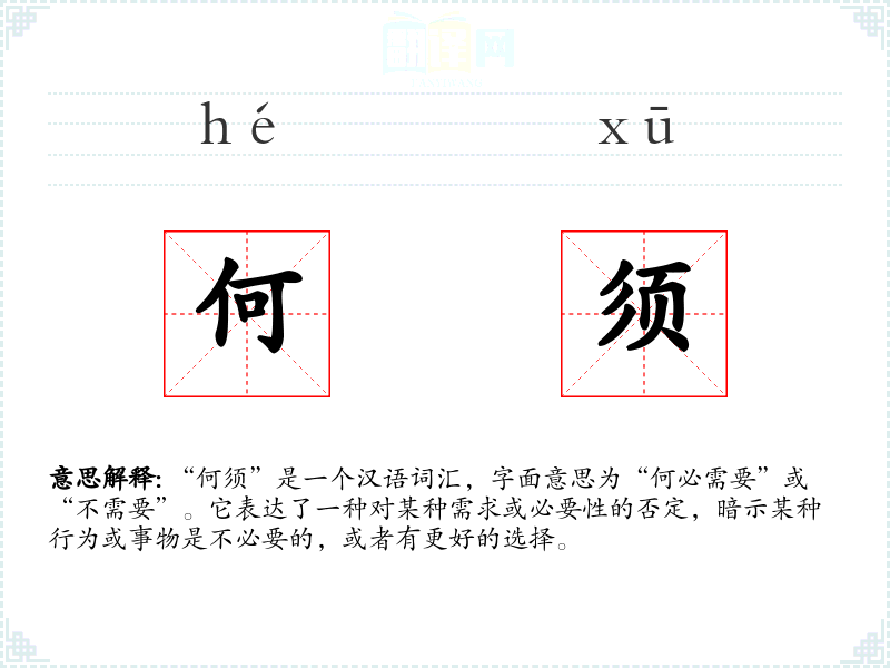 “何须”是一个汉语词汇,字面意思为“何必需要”或“不需要”。它表达了一种对某种需求或必要性的否定,暗示某种行为或事物是不必要的,或者有更好的选择。