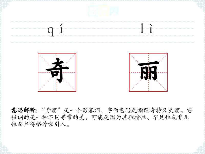 “奇丽”由“奇”和“丽”两个字组成。“奇”字古汉语中指不寻常、罕见,而“丽”字则指美丽。这两个字的结合,形成了强调独特美感的词汇。