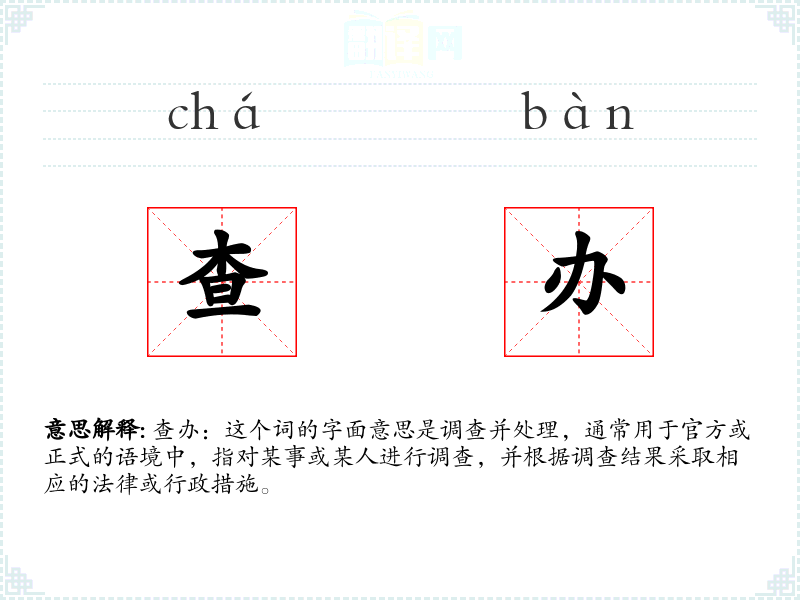 查办:这个词的字面意思是调查并处理,通常用于官方或正式的语境中,指对某事或某人进行调查,并根据调查结果采取相应的法律或行政措施。