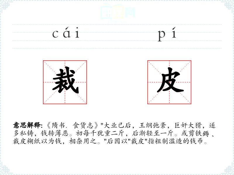 ,遂多私铸,钱转薄恶。初每千犹重二斤,后渐轻至一斤。或剪铁鎒﹑裁皮糊纸以为钱,相杂用之。"后因以"裁皮"指