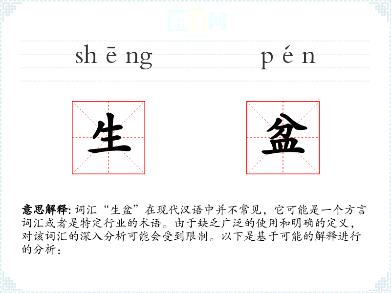 - 反义词:(由于“生盆”不是一个常用词汇,反义词可能不明确)