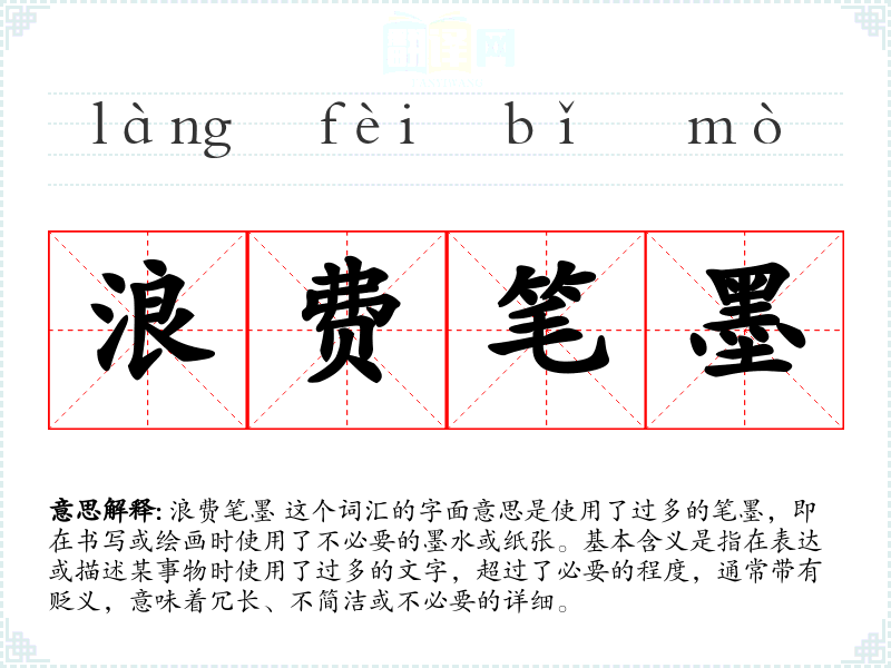 浪费笔墨 这个词汇的字面意思是使用了过多的笔墨,即在书写或绘画时使用了不必要的墨水或纸张。基本含义是指在表达或描述某事物时使用了过多的文字,超过了必要的程度,通常带有贬义,意味着冗长、不简洁或不必要的详细。