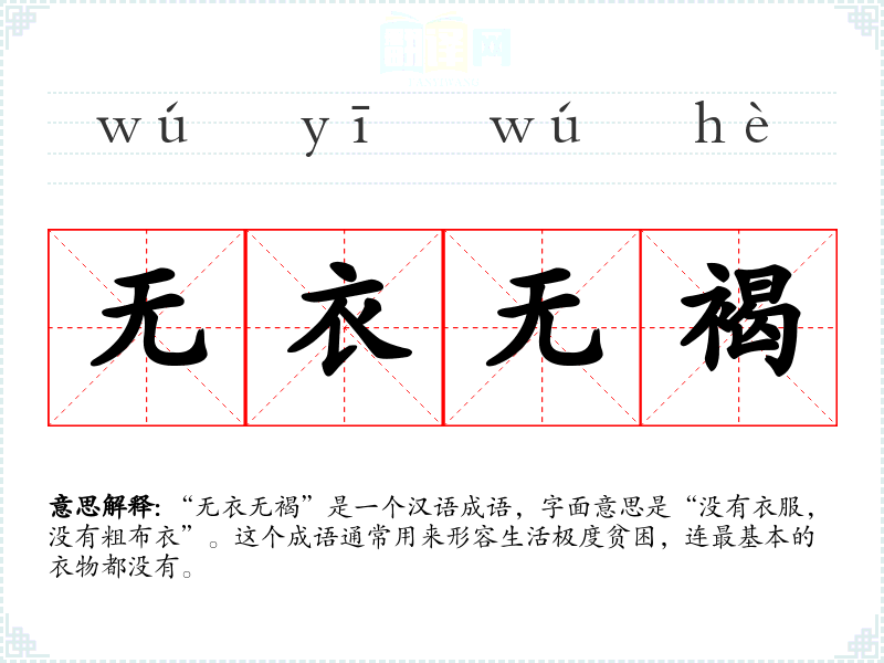 “无衣无褐”是一个汉语成语,字面意思是“没有衣服,没有粗布衣”。这个成语通常用来形容生活极度贫困,连最基本的衣物都没有。
