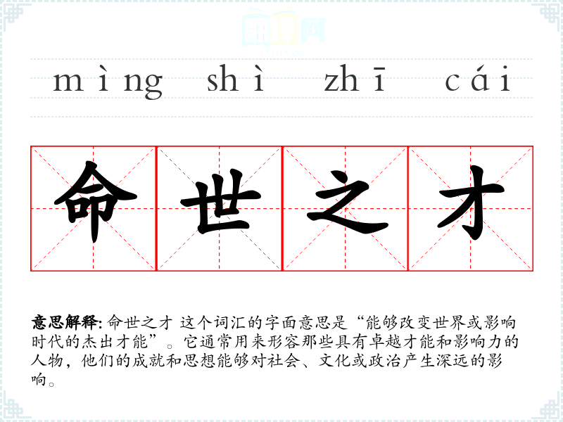 命世之才 这个词汇的字面意思是“能够改变世界或影响时代的杰出才能”。它通常用来形容那些具有卓越才能和影响力的人物,他们的成就和思想能够对社会、文化或政治产生深远的影响。