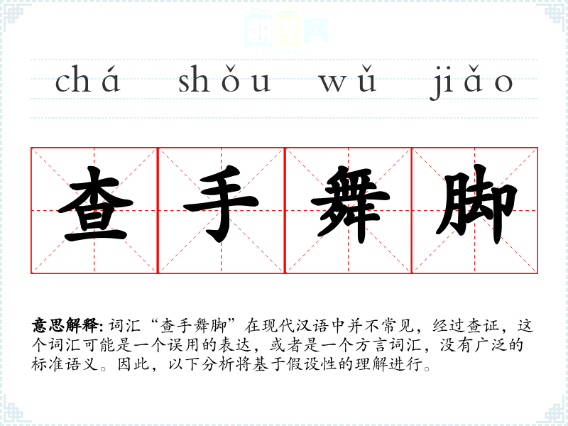词汇“查手舞脚”在现代汉语中并不常见,经过查证,这个词汇可能是一个误用的表达,或者是一个方言词汇,没有广泛的标准语义。因此,以下分析将基于假设性的理解进行。