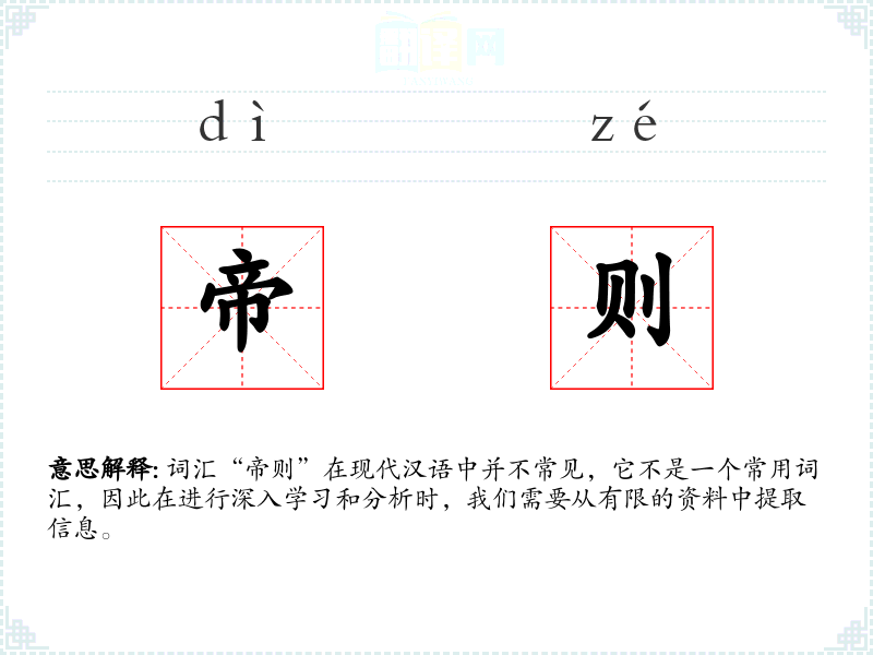 词汇“帝则”在现代汉语中并不常见,它不是一个常用词汇,因此在进行深入学*和分析时,我们需要从有限的资料中提取信息。