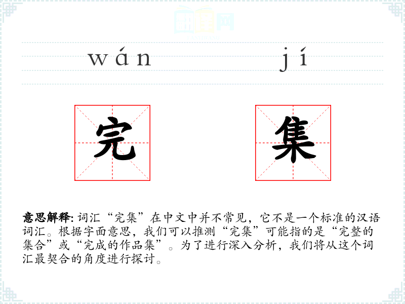 词汇“完集”在中文中并不常见,它不是一个标准的汉语词汇。根据字面意思,我们可以推测“完集”可能指的是“完整的集合”或“完成的作品集”。为了进行深入分析,我们将从这个词汇最契合的角度进行探讨。