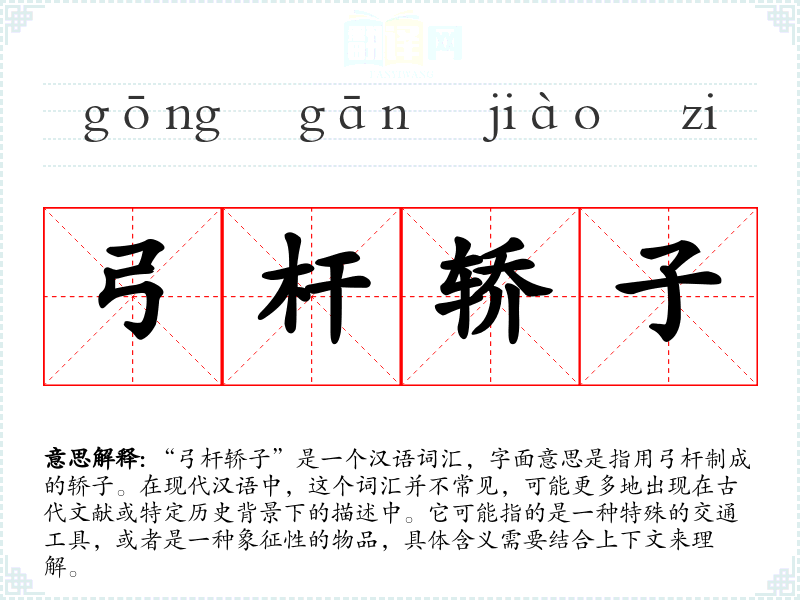 “弓杆轿子”是一个汉语词汇,字面意思是指用弓杆制成的轿子。在现代汉语中,这个词汇并不常见,可能更多地出现在古代文献或特定历史背景下的描述中。它可能指的是一种特殊的交通工具,或者是一种象征性的物品,具体含义需要结合上下文来理解。