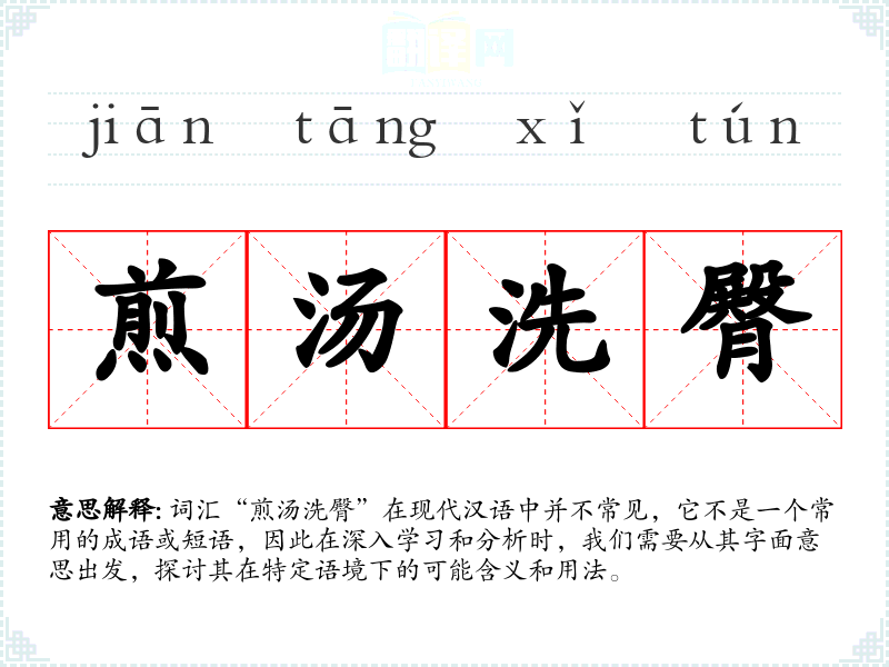 词汇“煎汤洗臀”在现代汉语中并不常见,它不是一个常用的成语或短语,因此在深入学*和分析时,我们需要从其字面意思出发,探讨其在特定语境下的可能含义和用法。