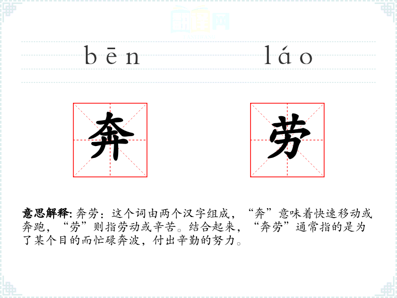 奔劳:这个词由两个汉字组成,“奔”意味着快速移动或奔跑,“劳”则指劳动或辛苦。结合起来,“奔劳”通常指的是为了某个目的而忙碌奔波,付出辛勤的努力。