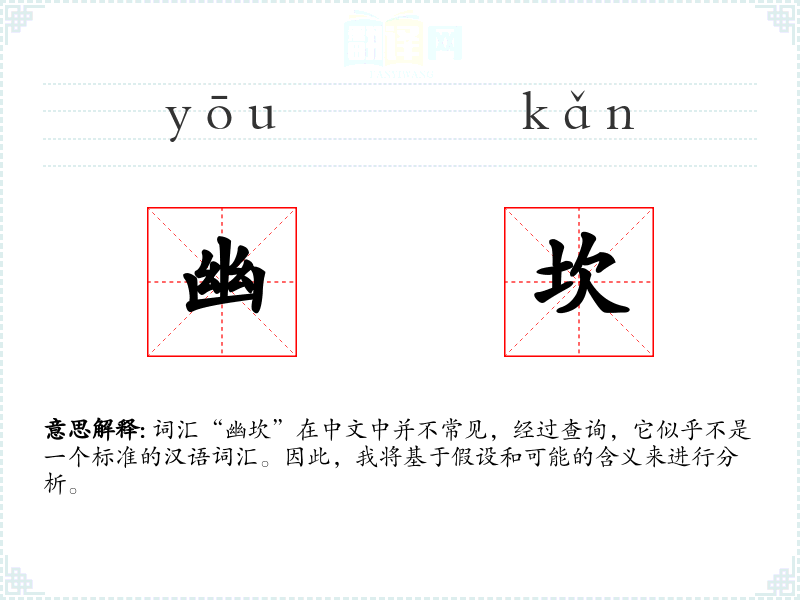 词汇“幽坎”在中文中并不常见,经过查询,它似乎不是一个标准的汉语词汇。因此,我将基于假设和可能的含义来进行分析。