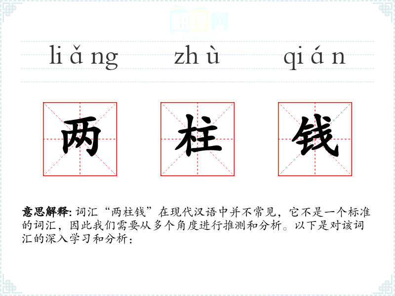 词汇“两柱钱”在现代汉语中并不常见,它不是一个标准的词汇,因此我们需要从多个角度进行推测和分析。以下是对该词汇的深入学*和分析: