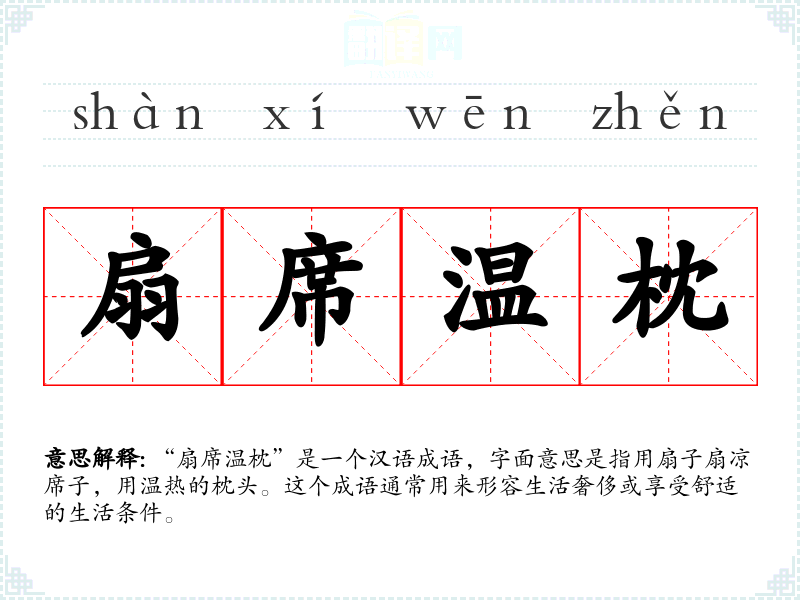 “扇席温枕”是一个汉语成语,字面意思是指用扇子扇凉席子,用温热的枕头。这个成语通常用来形容生活奢侈或享受舒适的生活条件。