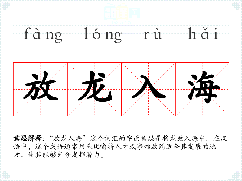 “放龙入海”这个词汇的字面意思是将龙放入海中。在汉语中,这个成语通常用来比喻将人才或事物放到适合其发展的地方,使其能够充分发挥潜力。
