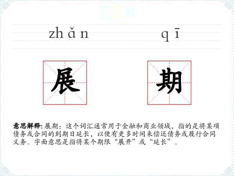 展期:这个词汇通常用于金融和商业领域,指的是将某项债务或合同的到期日延长,以便有更多时间来偿还债务或履行合同义务。字面意思是指将某个期限“展开”或“延长”。